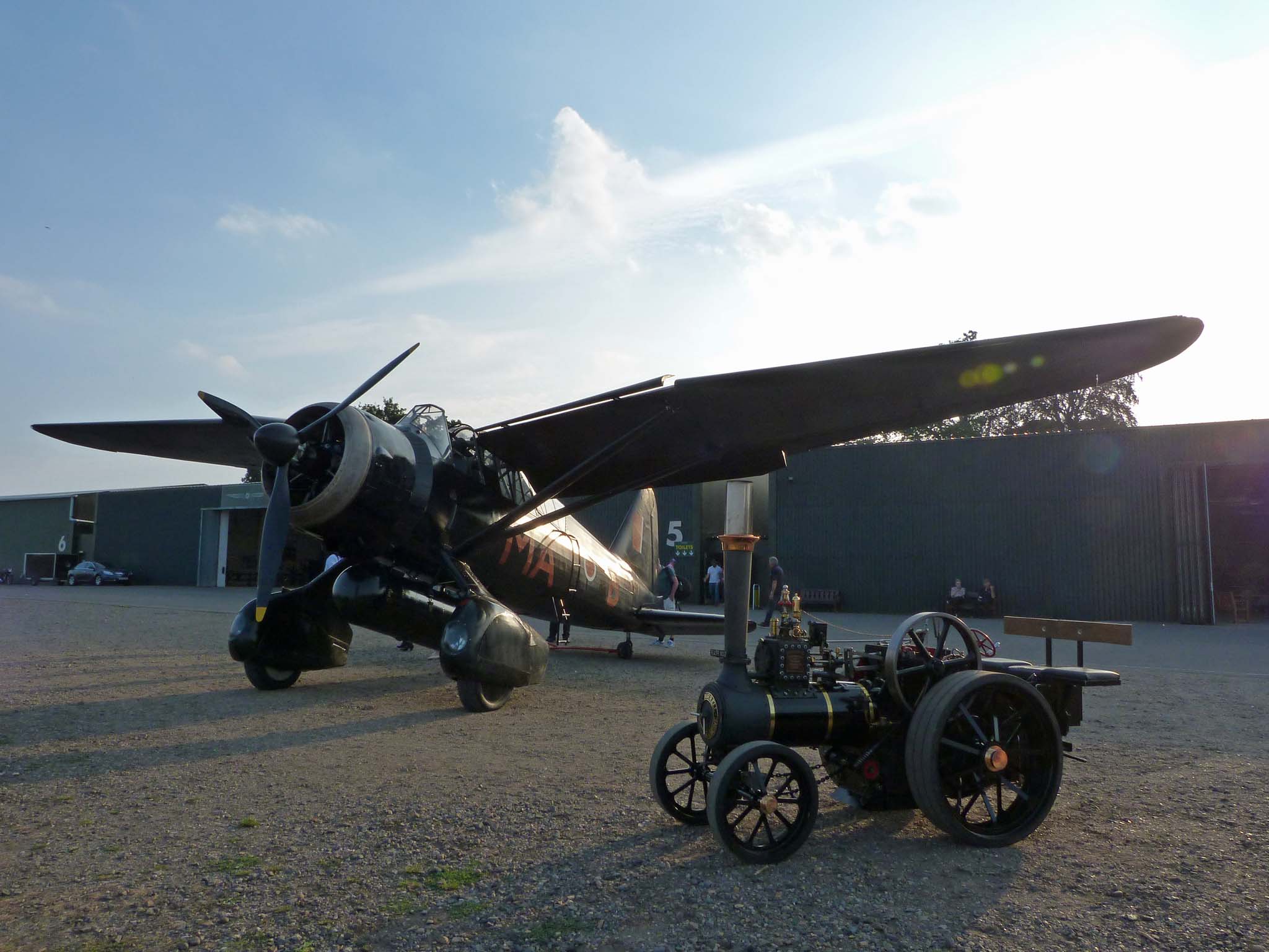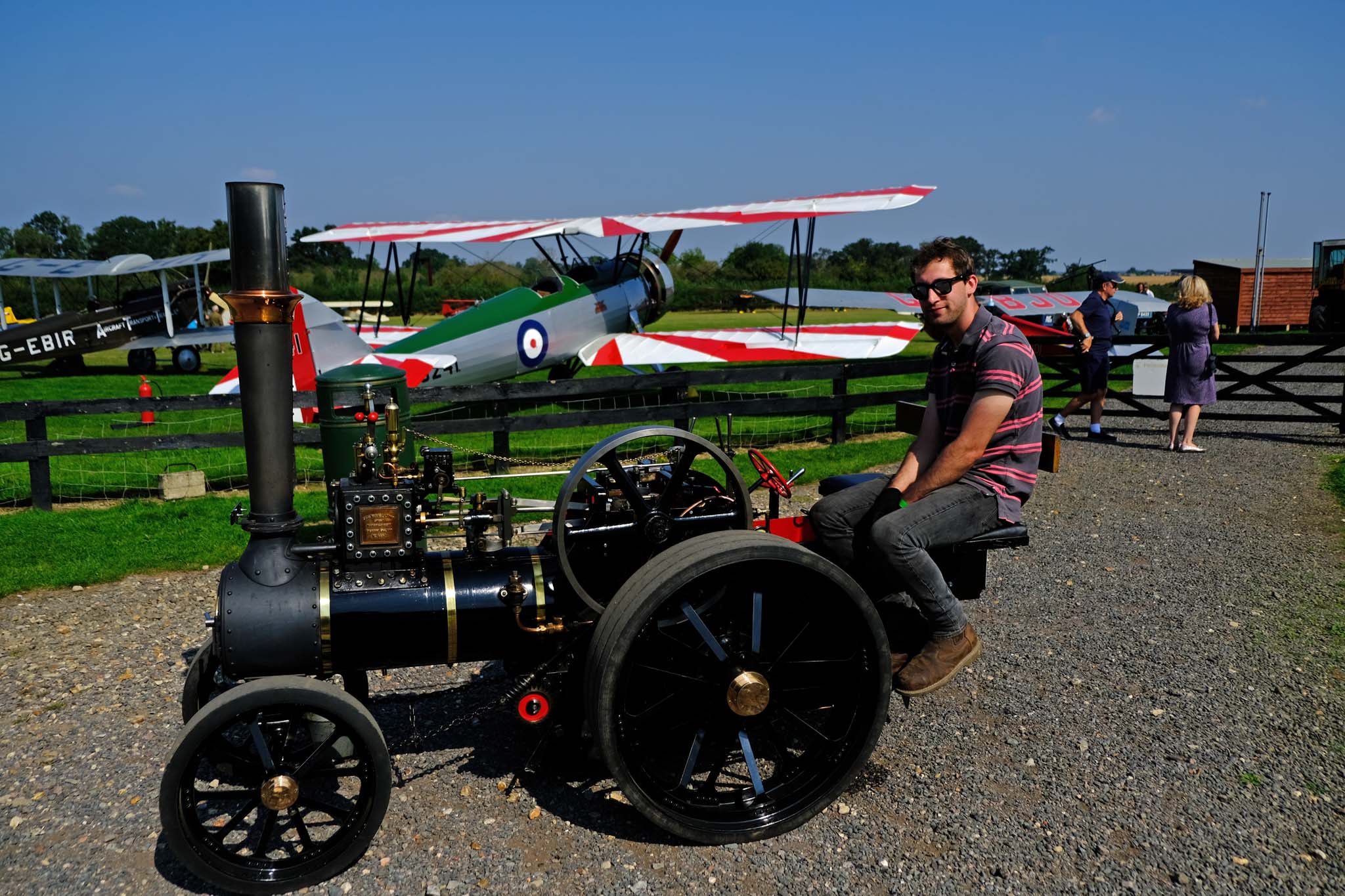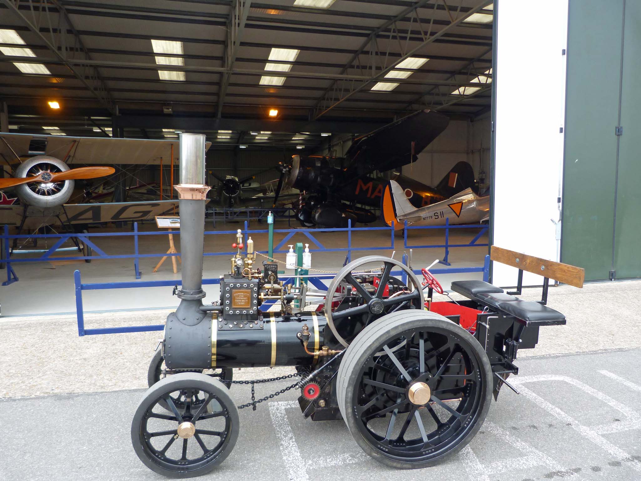 The Saturday was open to the public and a combination of the additional vintage vehicles and sunny weather drew extra visitors, hopefully enough to encourage them to invite steam traction engines back in future years. But the main day was Sunday when we had a full airshow and Stuart came along and had a ride on our engine before the air show started. Sunny weather and light winds allowed for the display of most of the collection from their Spitfire, Lysander, Gladiator and Polikarpov Po-2 WW2 aircraft, to the 1920s and 30s inter-war years racers like the DH 88 Comet and Mew Gull, WW1 Sopwith Pup, Camel, Triplane, Bristol M.1C and RAF SE5A, then the Edwardian period Bristol Boxkite, Roe Triplane and Blériot, though Stuart tells me that the Blériot got slightly damaged during its attempted flight. The highlight of the weekend for my son was getting an opportunity to take some photos of our engine with his favourite aircraft, the Westland Lysander. After the Lysander had completed its display and had been towed back to the apron outside the hangar, we were allowed to drive our engine up to the Lysander for photos, the staff and volunteer marshals just couldn't have been more helpful and accommodating. The only price was to give one of the volunteer marshals "steam-mad" 6-year-old son a ride on our engine, a small price to pay indeed.