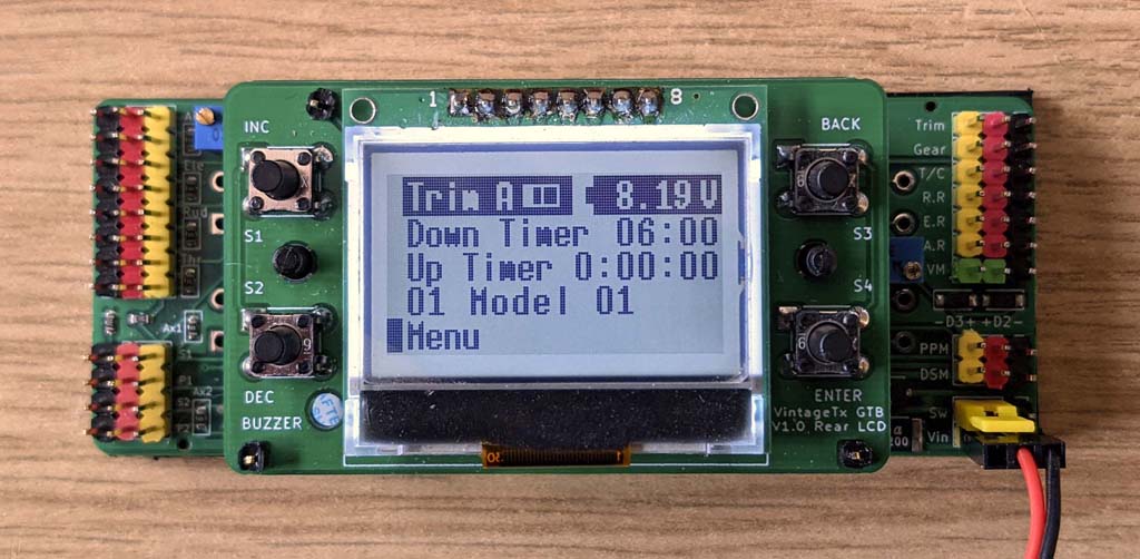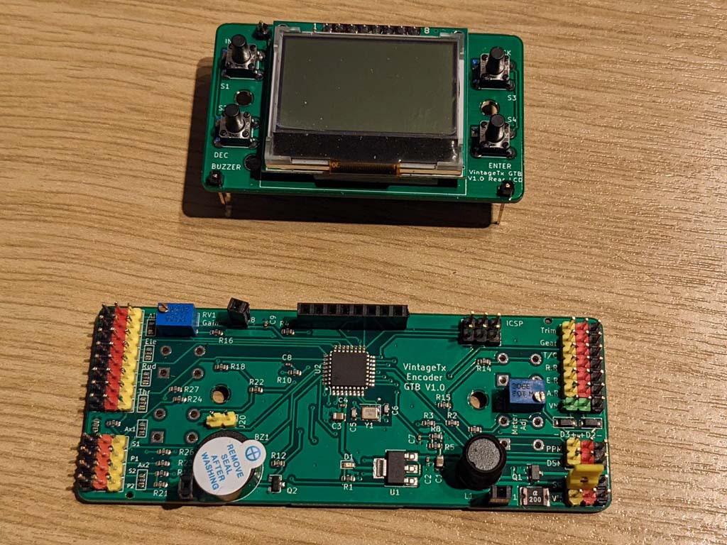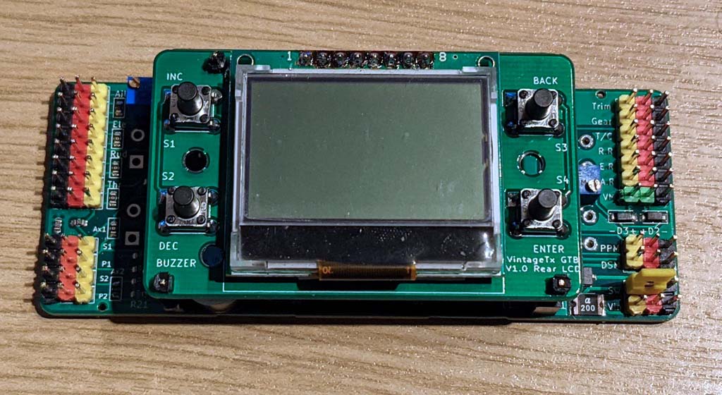 It's been a busy week as I've had a delivery from JLCPCB with four different encoders (see other posts for the other encoders), this one is for mounting in transmitters with easy to remove back covers, such as MacGregor Digimac's or Horizon HSE that don't have labels on the front to hide the LCD and menu keys. It uses the board from my standard GTB encoder with a daughterboard to mirror/reverse the LCD connections as it's mounted to the rear and also raise the LCD and menu keys away from the joystick/switch wiring. Once I finish a Futaba M6 conversion, an unused MacGregor Digimac III converted at the factory to 4 channel will be converted as a test-bed, but I'm not expecting any snags as the encoder in its standard form is now well-proven.