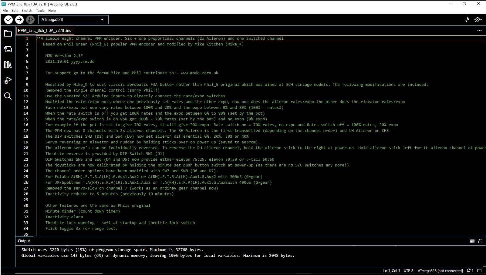 I had never tried compiling the encoder sketch with the latest Arduino 2.03 as I've stuck with the older 1.8.19 as the latest version just takes so long to fire up compared to 1.8.19 (and I have a reasonably fast i7 SSD PC). So I fired up 2.03, and it compiled PPM_Enc_8ch_F3A_v2.1F without a problem (see screenshot below).