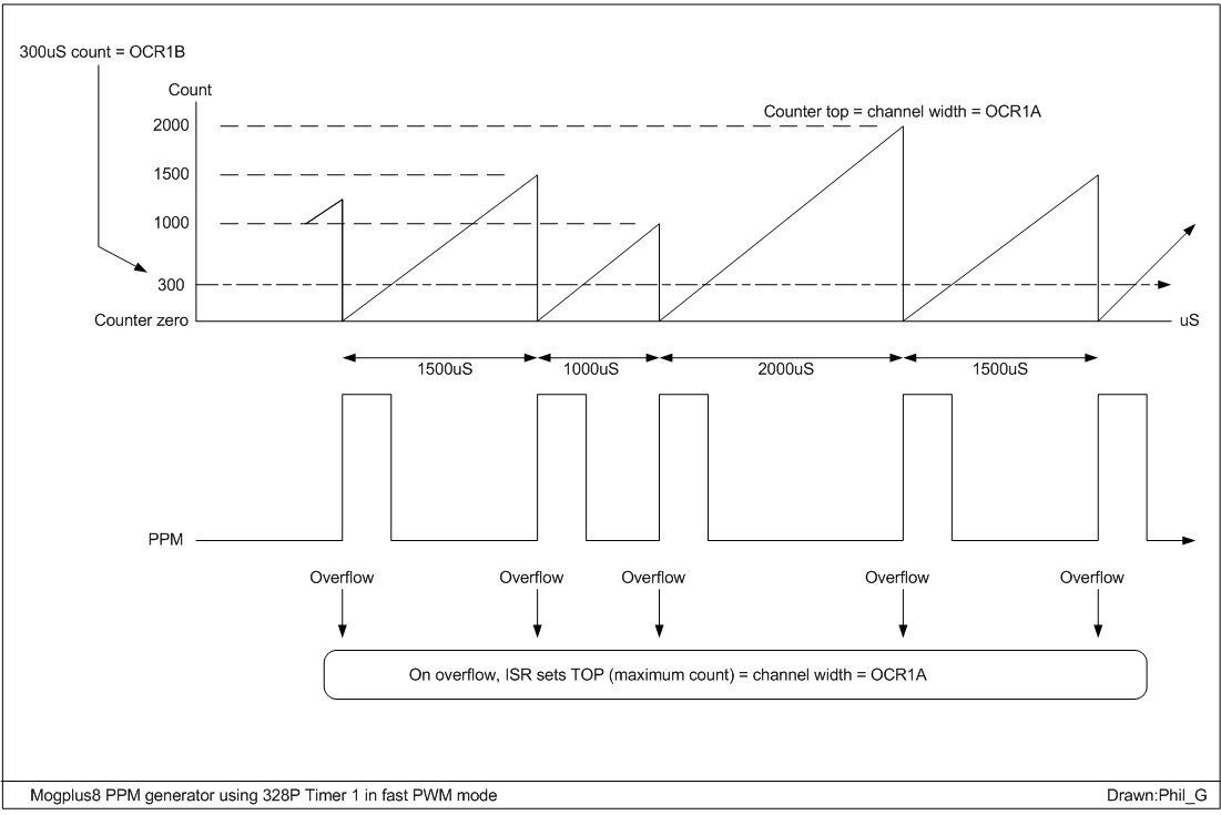 The Reeduino uses Hasi interrupt-driven PPM which works perfectly but I just liked the simplicity & economy of Ians code.I drew a diagram to help me understand how the timer was configured, for clarity it ignores the 'double values with 0.5uS clock' thing.