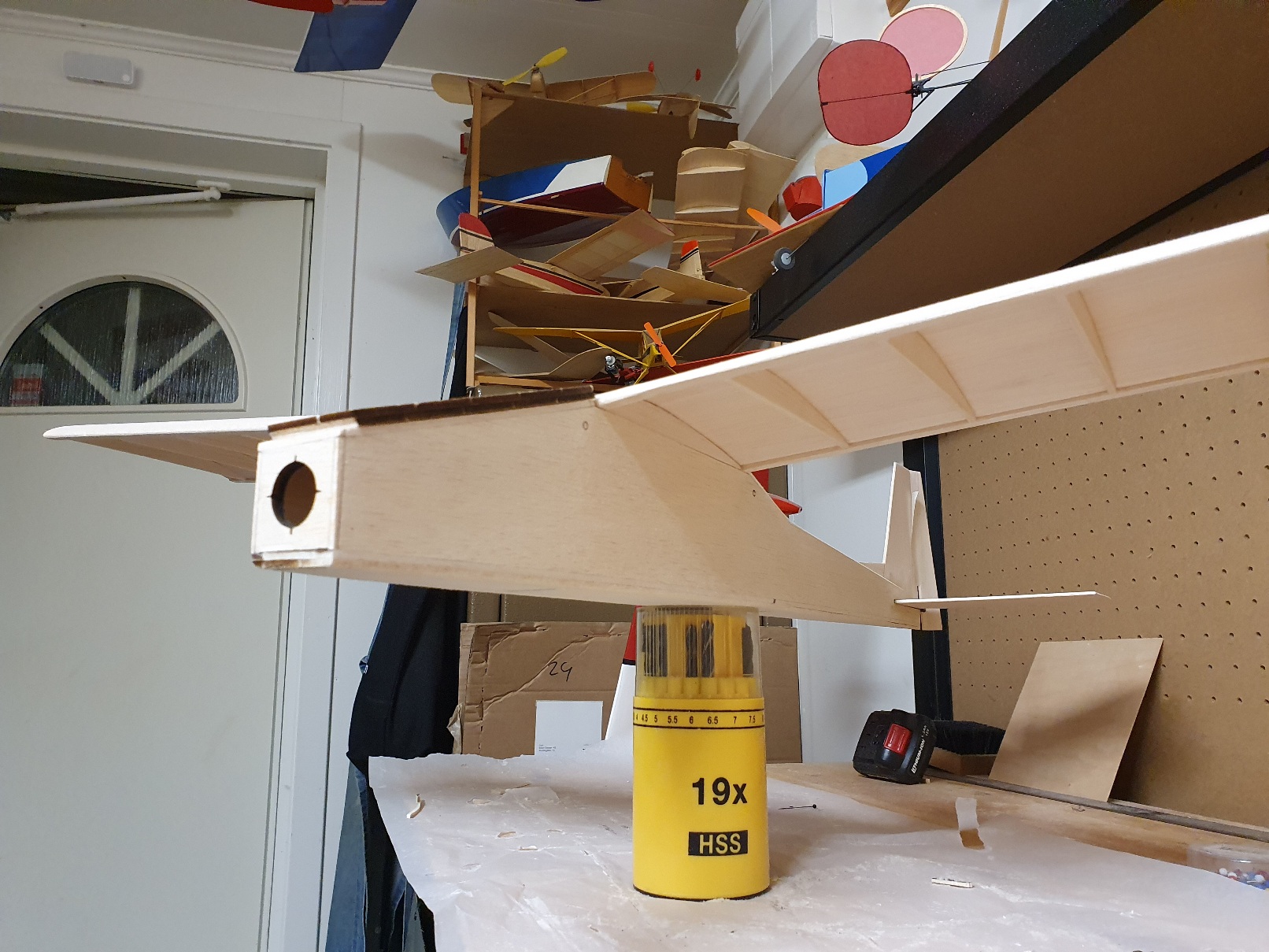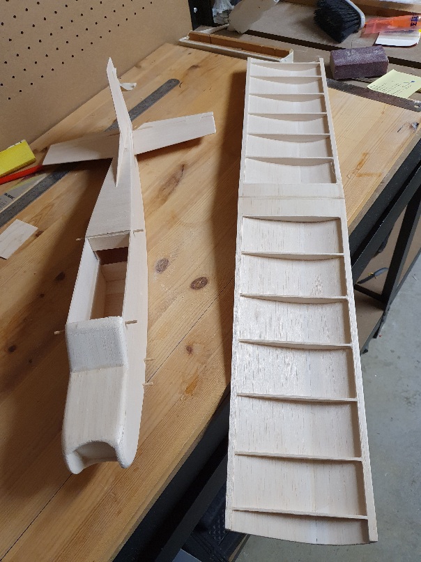 You can almost sit on this wing as it's extremely sturdy, 3/32" sheeting with curvature that gives a form factor stability with leading and trailing edge but if they brake it we just build a new one and also this is part of the hobby! If....Remember that this has to be built by a 10 & 12 old boys so anything thinner than 3/32" will call for help. My first R/C model that my dad built to me 1968 was built in this way and believe it or not it's still in one piece! The span is 65 cm