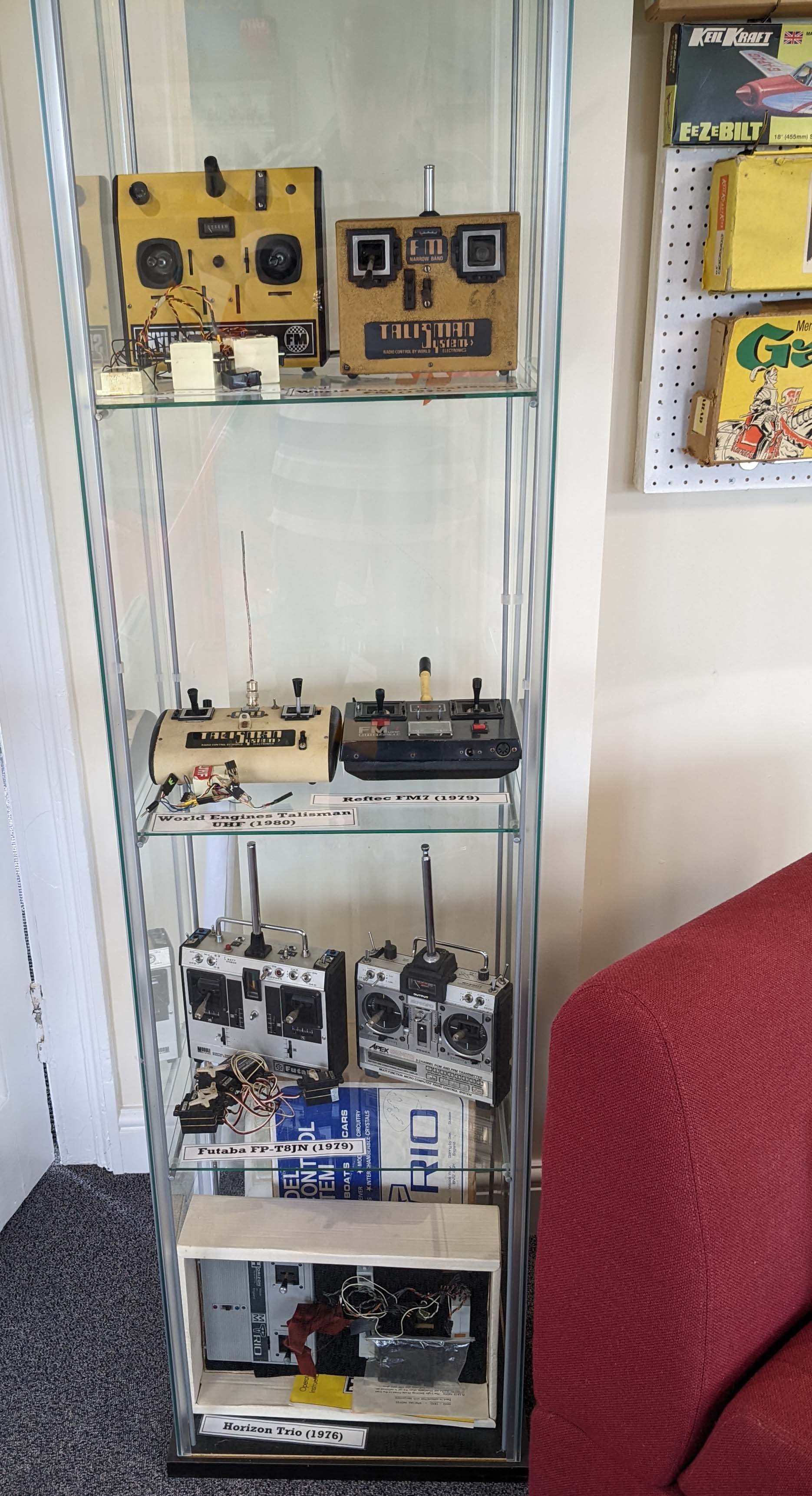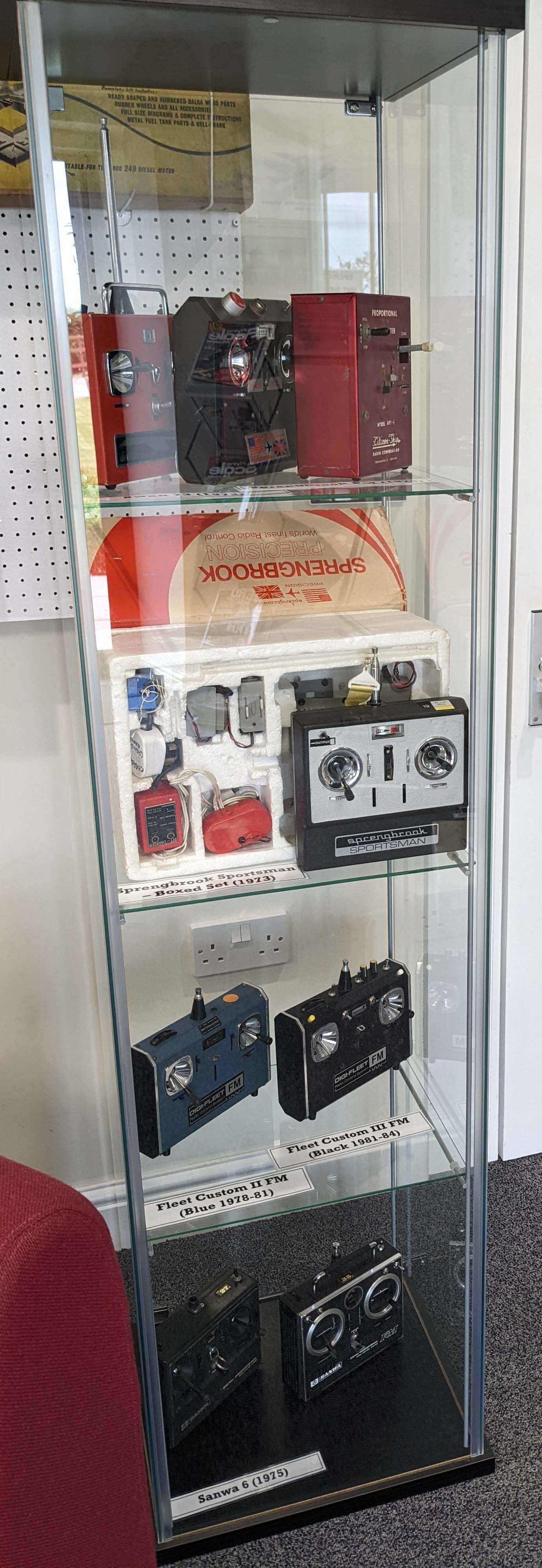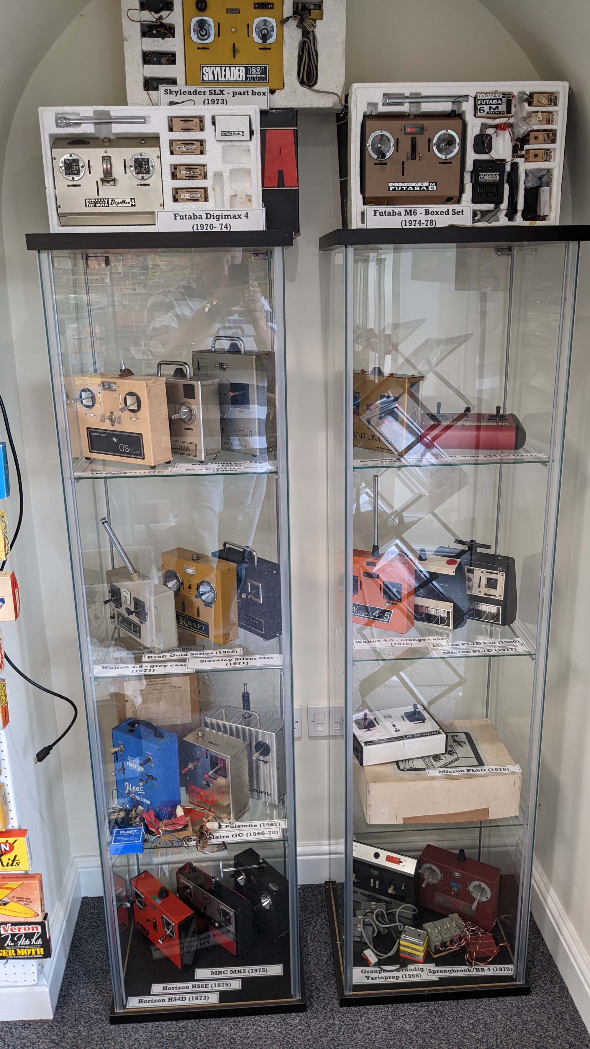 The radios are from my "reserve collection", they're ones I have duplicates of, so if anything should happen to them, I've still got at least one of them. They range from 1950s ED ground-based sets, later ED and REP sets, RCS S/C, reeds and propo, ABC, Controlaire, MacGregor and Futaba S/C sets, Remcon, F&M Matador Orbit and OS reeds, Graupner Variophon, Fleet, Controlaire and Citizenship GG sets, then the common 1970s propo sets such as Futaba, Skyleader, Kraft, Macgregor, Horizon, World Engines, Micron, RCM&E FM, OS, Remcon, Sanwa, Waltron, Graupner, Swan, Staveley and Sprengbrook. I know they don't look as "vintage" but I also included a Futaba J series (in my view the first "modern" set) and a JR Apex Computer (first mass-produced computer radio with LCD and menu switches). There would have been Flight Link sets, but I sold them to Stuart Mackay, a Simprop set that I sold and a MacGregor GG set but swapped it for a Gallatrol!