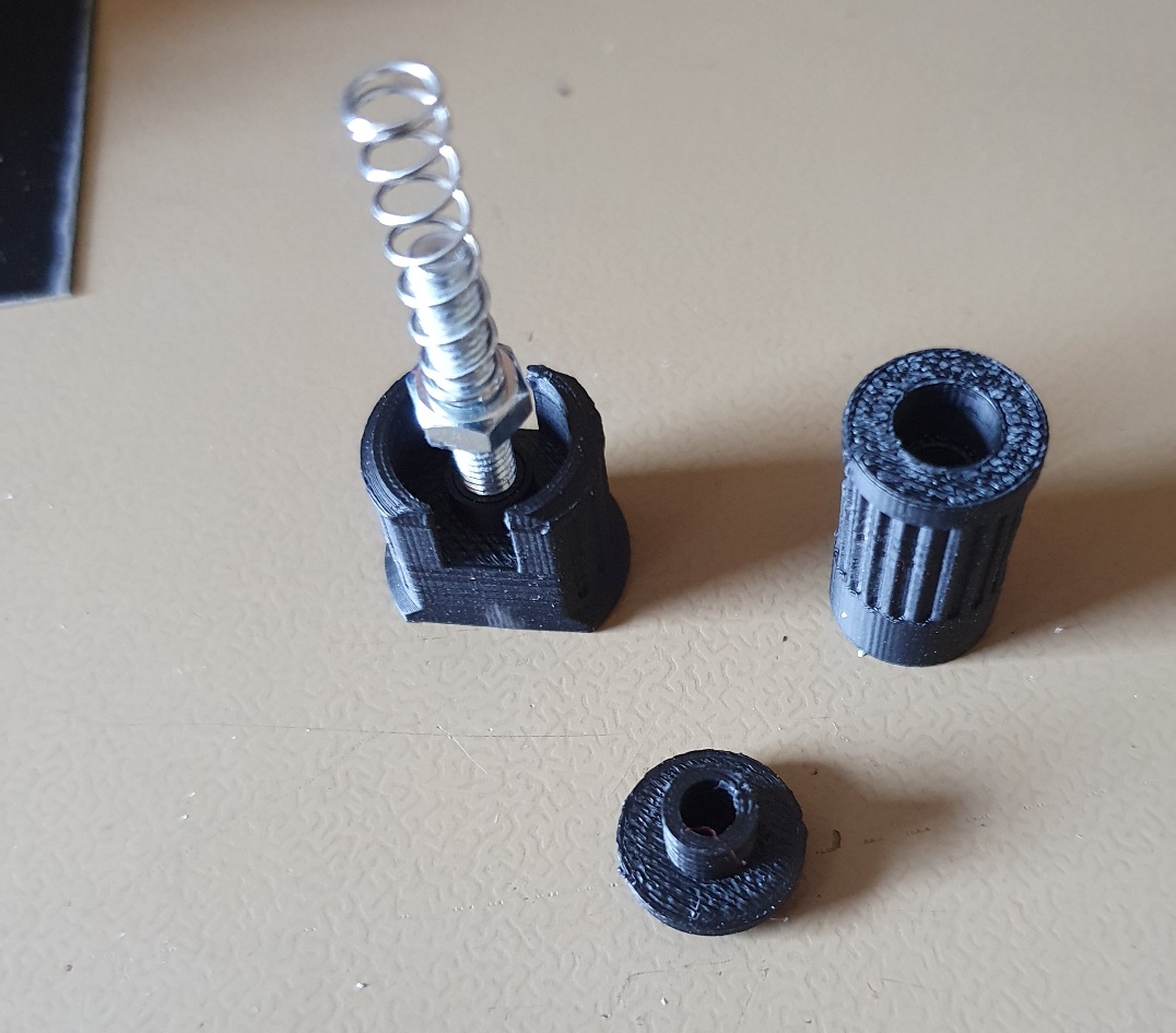 The nut slides into to the middle piece that when rotated will first regulat the spring tension but eventually lock the PCB if needed.