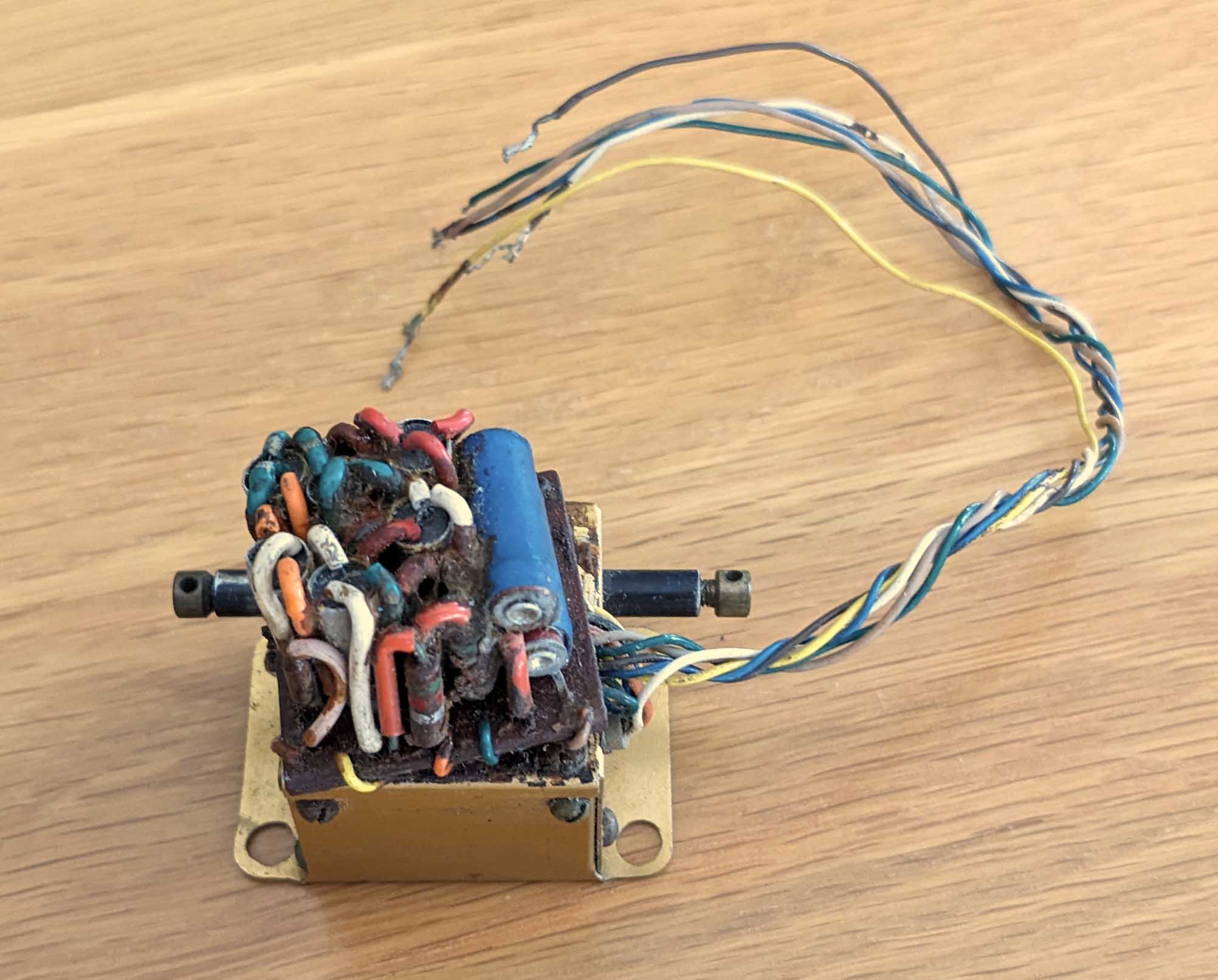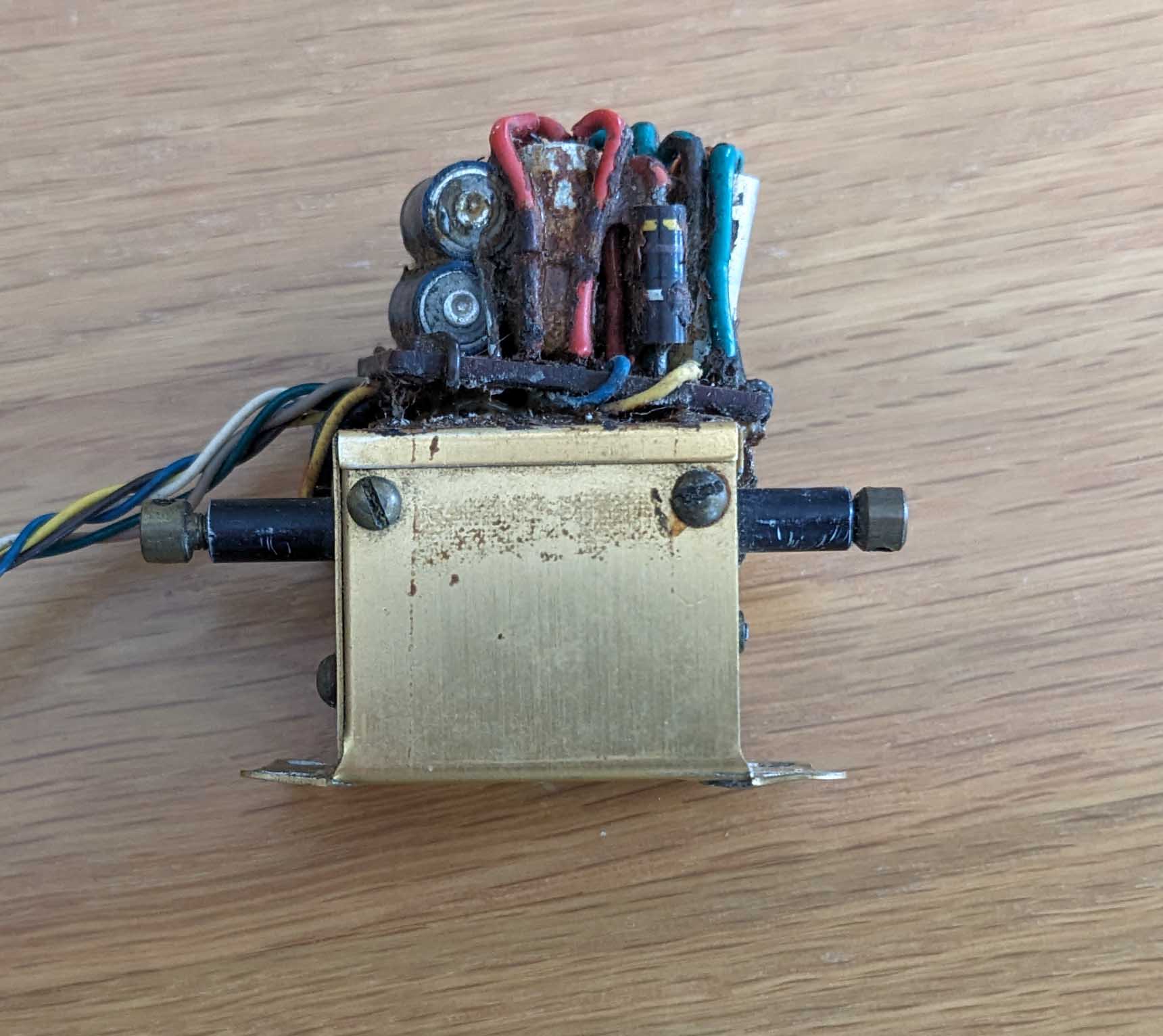 The "job lot" came with a "servo" I'm not familiar with. It's got an anodised gold case, the case is 30mm x 30mm x 25mm high, but it's just the motor and limit switches (wipers on PCB tracks), the case is too small for the electronics and the circuit board sits on top of the case (it's just glued on). It's like a miniature Bonner Transmite without the electronics. Anybody any idea what it is? Another linear servo for your photo Shaun!