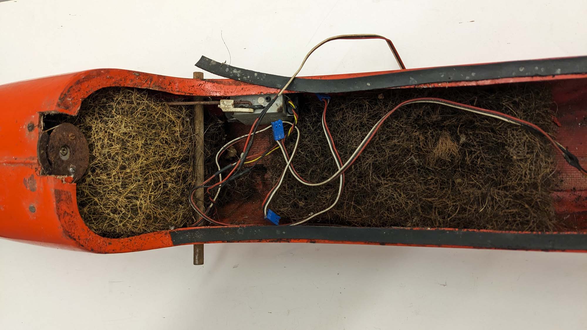 At first, I thought a mouse had made a home in all the fuselages, it looked like grass, but it's actually a type of wadding (I think that is what it's called), around the tank and receiver. There's a 12oz tank (Carl Goldberg I think) in the nose and I found an ancient lump of lead to get the c of g correct. The elevator uses a normal balsa push rod. In fact everything is just like a normal 1970s model.