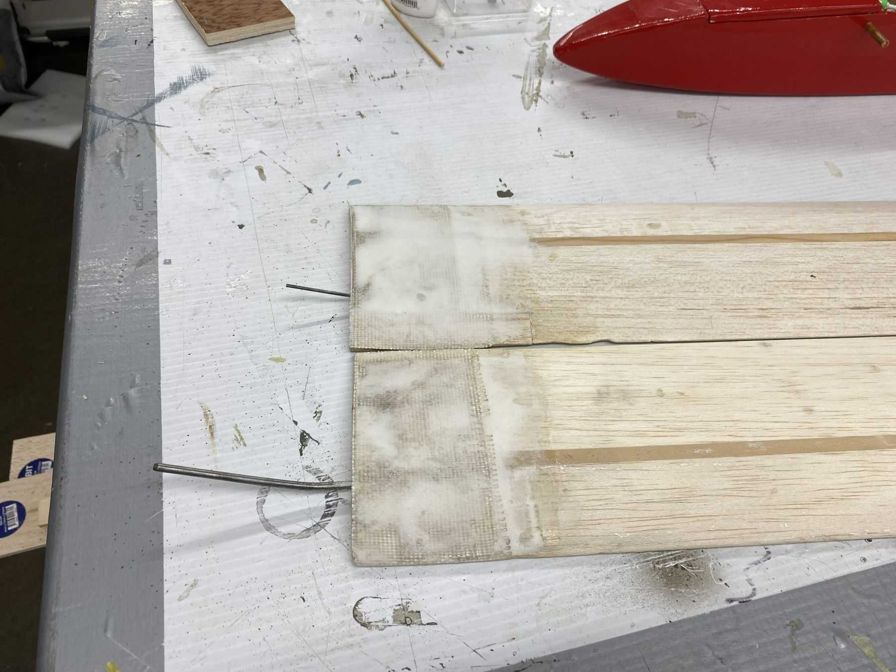 The wing roots have been repaired, with a replacement glasscloth bandage applied with Eze Kote and a smear of lightweight filler to fair it into the balsa repairs. All goes together nicely and will be recovered with white Solarfilm today.