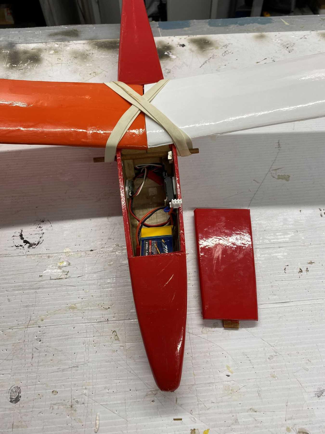 Miniphase restoration coming towards completion. Fuselage finished, all recovered, control surfaces rehinged and linkages restored, servos, receiver and a wee GWS 2A brushed ESC installed as a voltage regulator, to take a 2s1p 450mah lipo as a battery pack. I've inset a small hardwood block on the fuselage floor, under the servos to take a bungee hook and allow for adjustment in the position of that, but will try the model on the slope first.