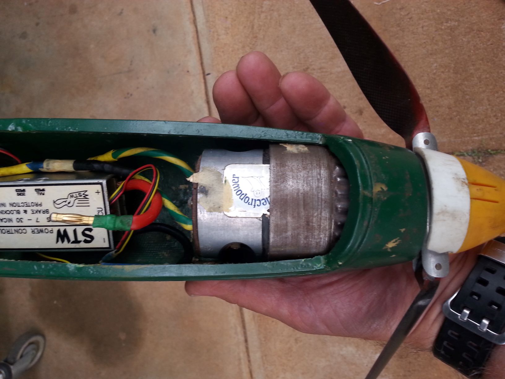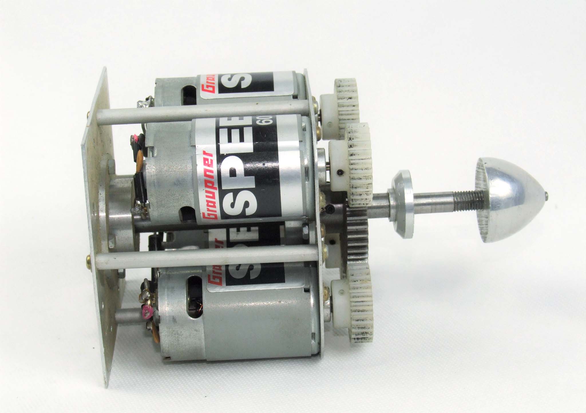 This is the Keller 100 (nominally a 1000w motor on 26-30 NiCd cells). This version is fitted with a belt reduction unit - it was in my "B" model at the 1986 World Championships. The 2810 out-runner is for size comparison.