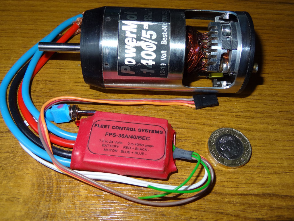 I bought this beasty many years ago, intending to convert my Lanzo Record Breaker (96-inch span) to electric. Pound coin for size comparison.
