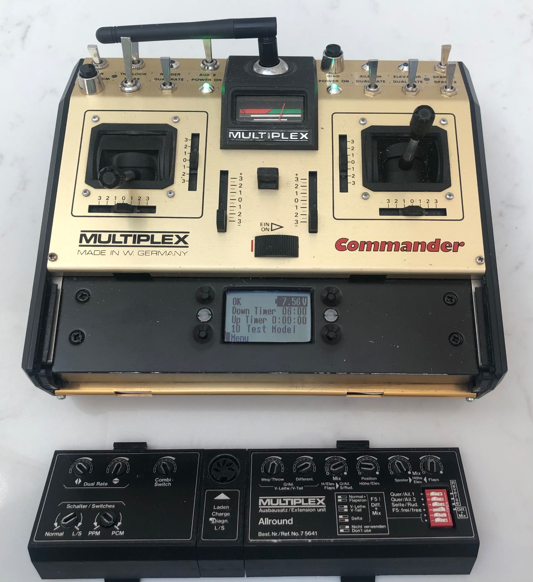Just thought I'd post some details of my latest conversion. A Multiplex Commander now fitted with one of Mike Kitchen's GTA encoders and a Lemon 2.4GHz RF module. Pretty much everything was removed from the case apart from the sticks, sliders and some of the switches. The original analogue encoder and mixing units were removed but care was taken to preserve the control panel and its controls at the bottom of the Tx.