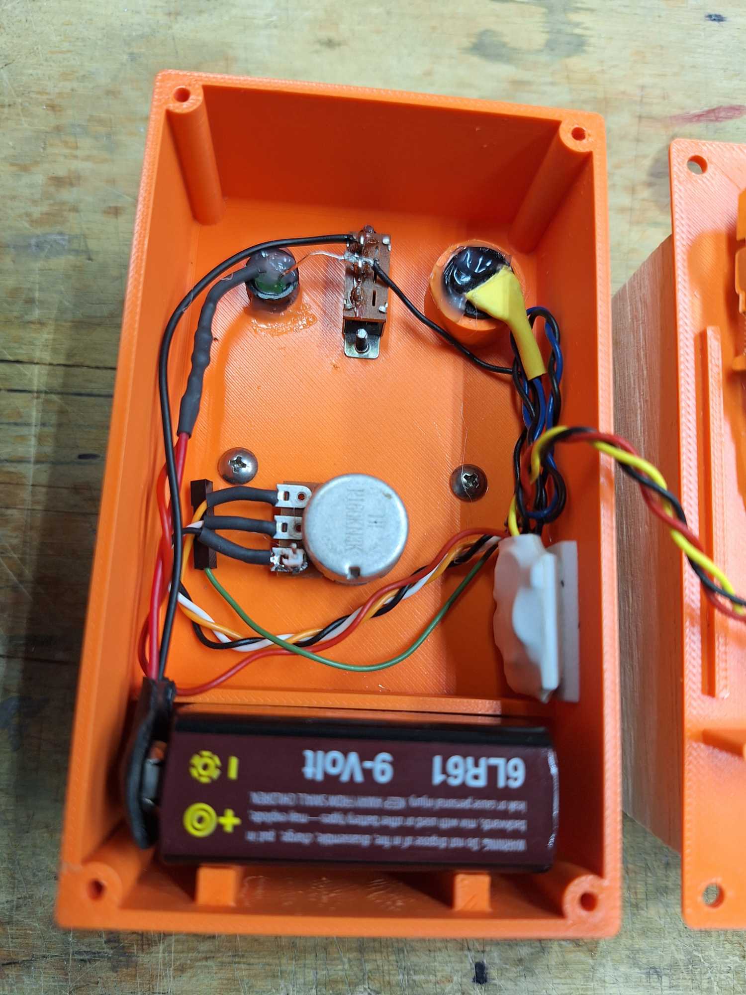 Phil provided a single green color wire to calibrate the throttle knob. During calibration it is grounded to any black wire coming out of the module. If you look closely you can see a single header pin soldered to the pots black lead. I simply connect the green wire to it for calibration. No trim function is provided nor needed. A buzzer is provided to warn unit is on after 30 minutes operation. I added the green LED with a 390R resistor in series that is hidden in the long black heat shrink tubing on the left. TX case is 110 by 60 by 30. I used Tinker Cad for the design and printed on my Bambu P1S 3D printer.