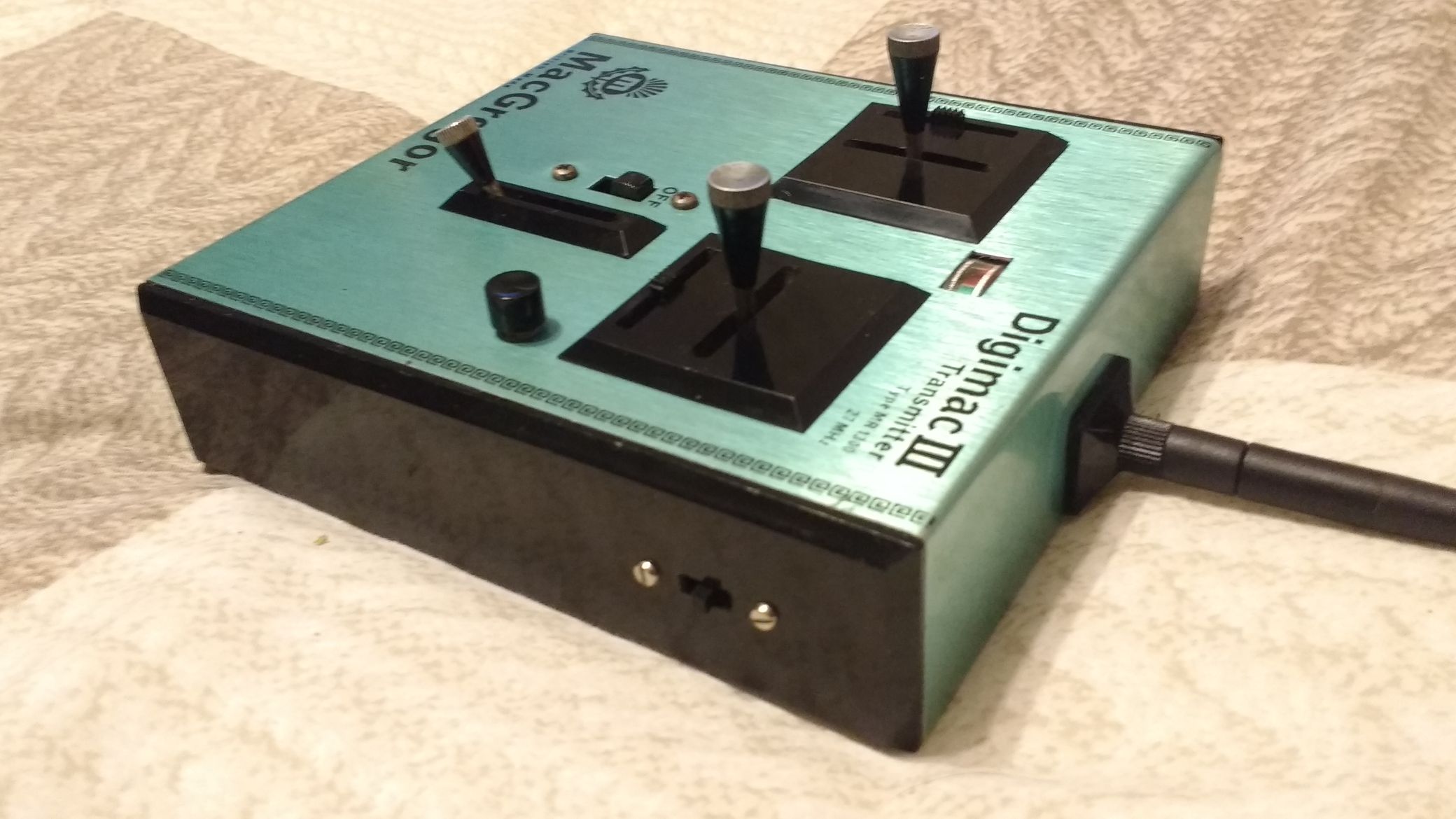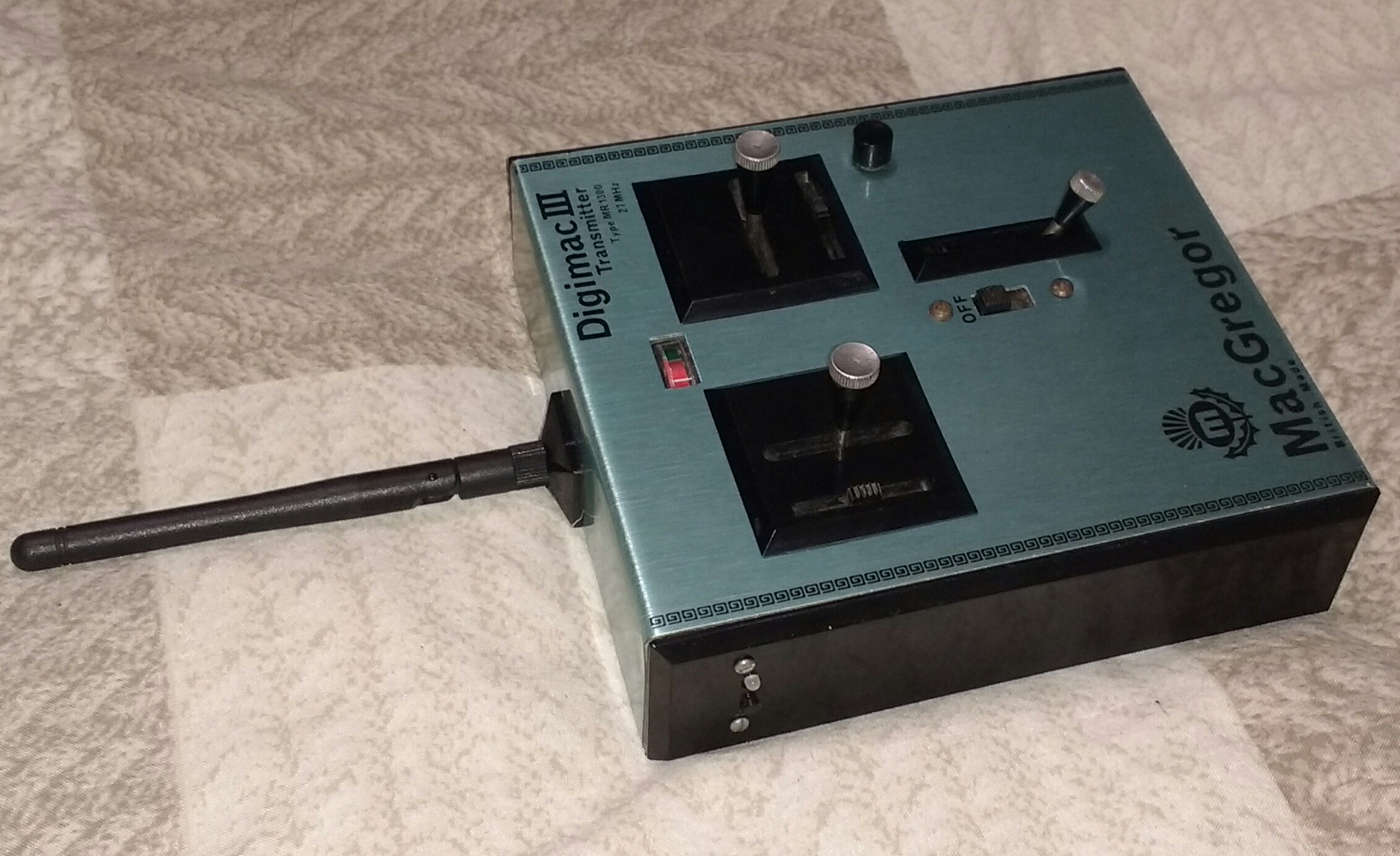 This is a minimal conversion of a Digimac III, using a 3 channel subset of the 7ch encoder, just rudder elevator & throttle, with S/C emulation and with Vtail & elevon mixers. Gary had already done the prep, it just needed a bit of fettling: