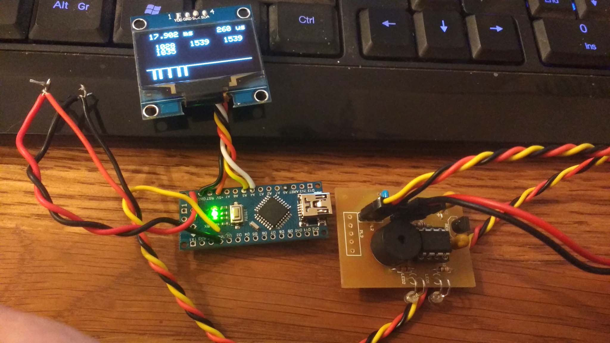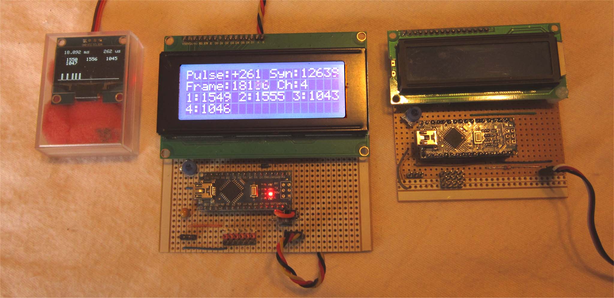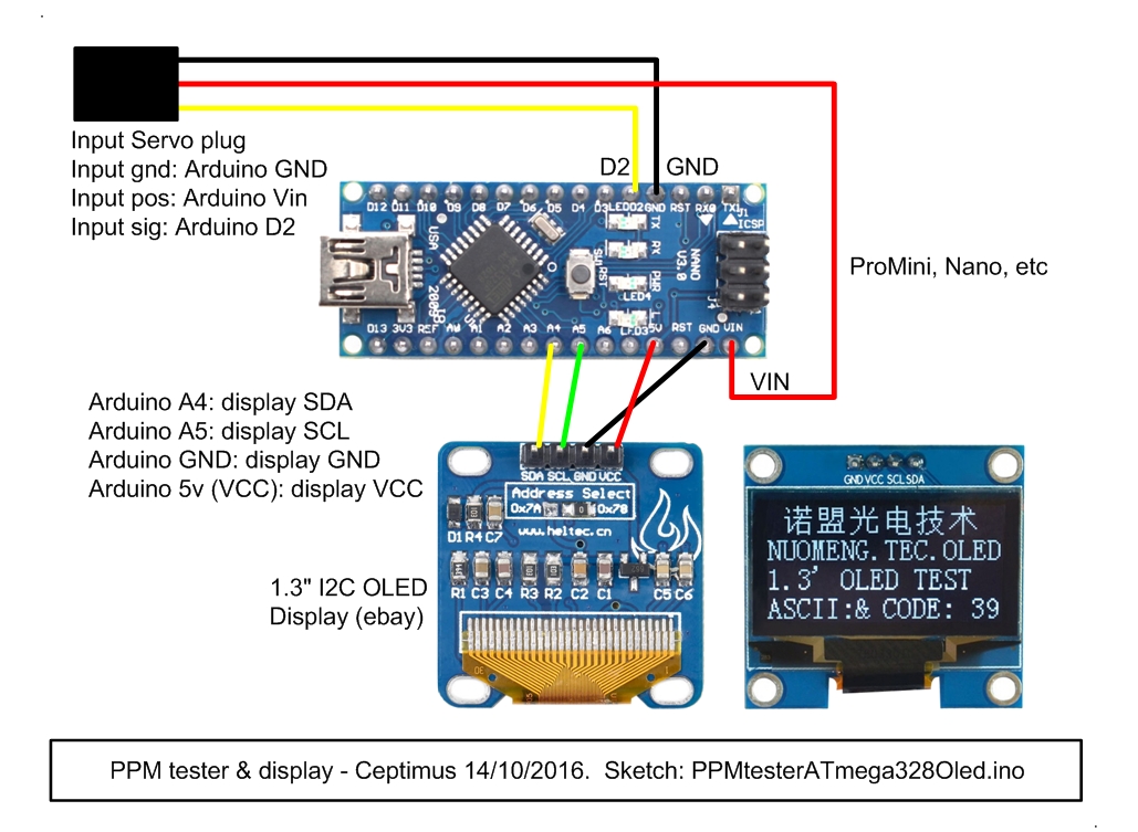 So this is Martins PPM tester project. It uses a 5v Pro-Mini, Nano or anything similar, and just a few connections. Note that the Pro-Mini needs A4 and A5 - some early ones didnt have either. If you use one of the very early Deek-Robot or DIY-More printed-circuit boards, remember that the original ones had A4 and A5 annotations reversed - this is not the case for the 'current' 2018 board, they fixed the mix-up. The display is a 1.3" OLED from ebay, for example https://www.ebay.co.uk/itm/1-3-inch-Blu ... 3393681269
