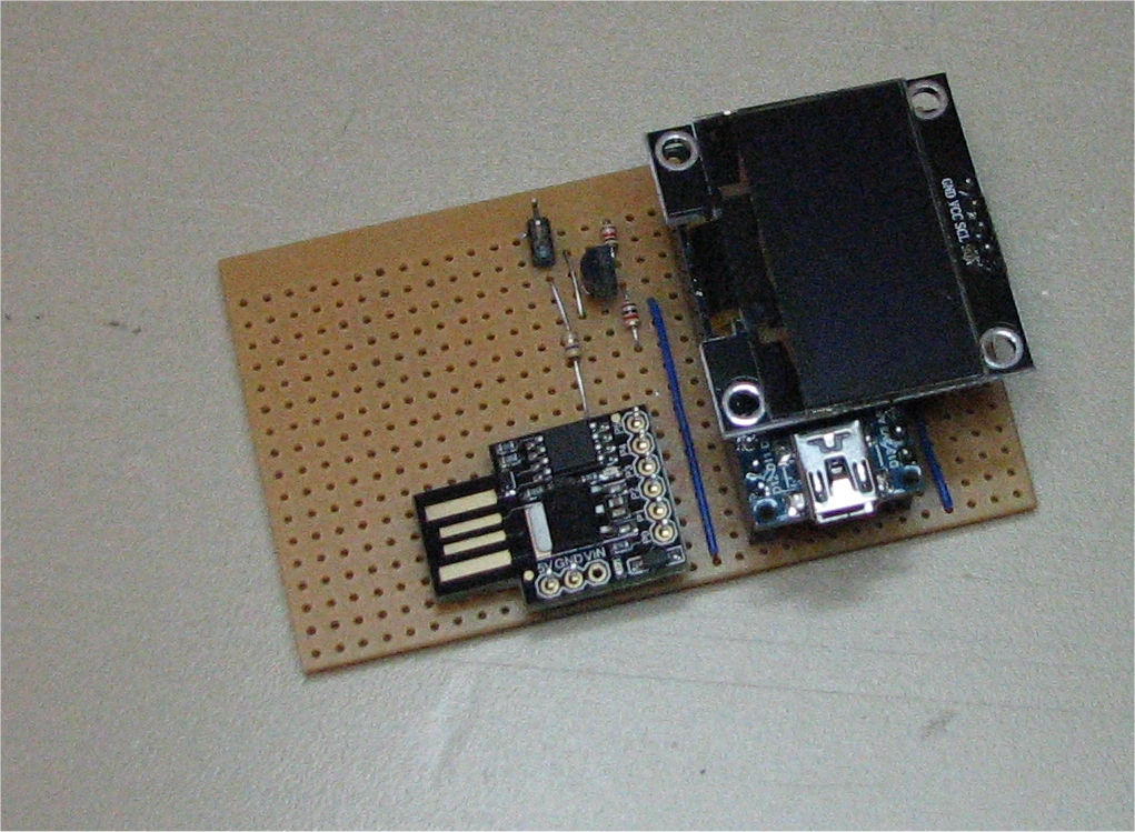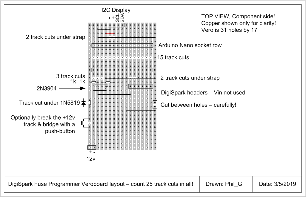 I've posted a few pics so the stripboard layout can be seen. Note the cut between vcc and ground on the 2-pin DigiSpark header.