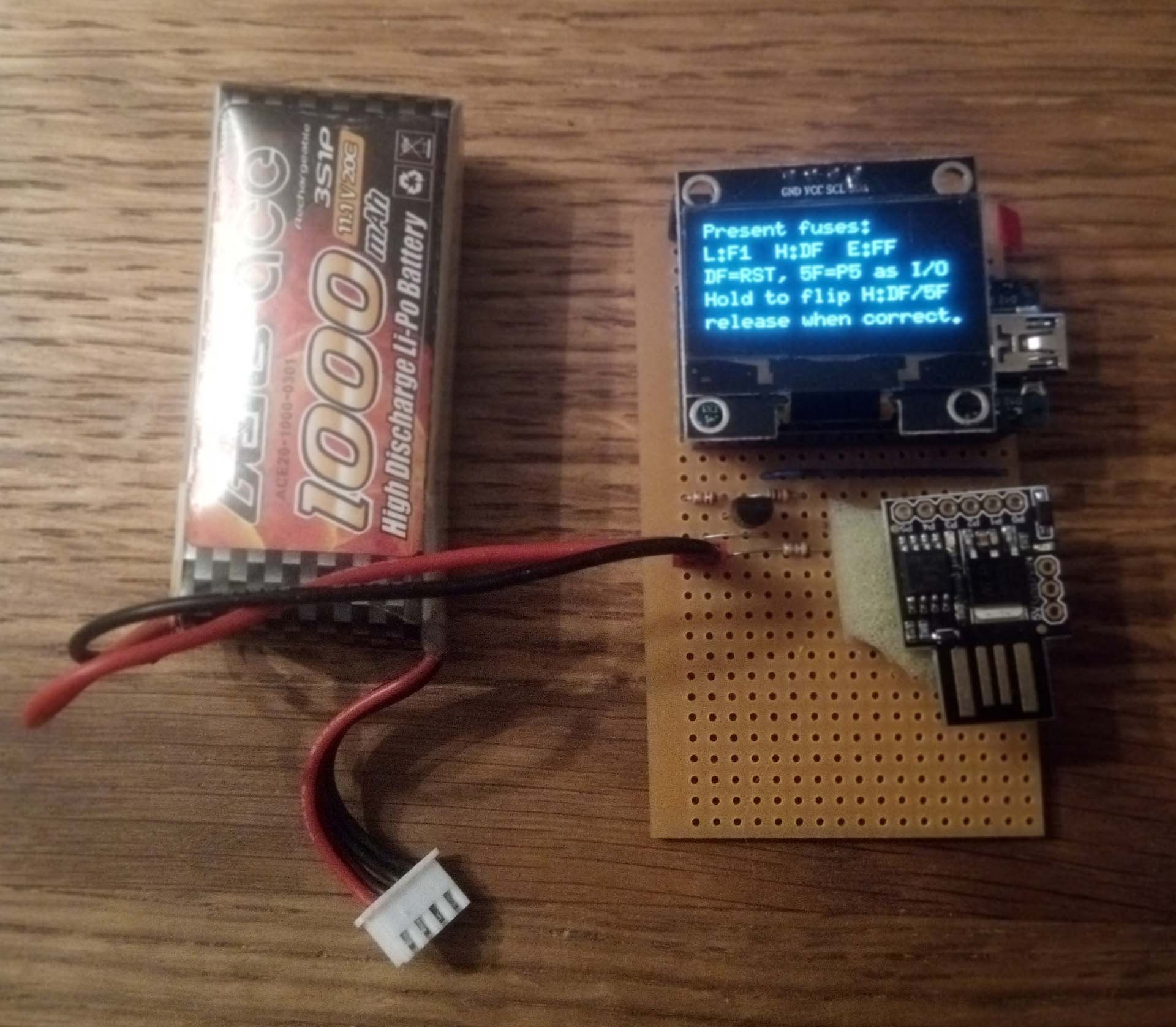 Its powered from something very near to 12v, I use a small 3S lipo which is perfect. It has to be close to 12v as thats the fuse programming voltage.