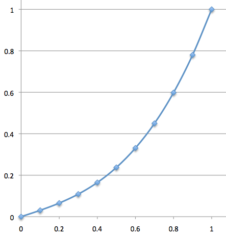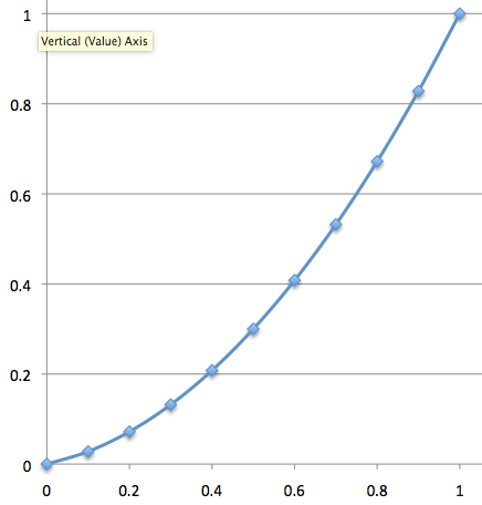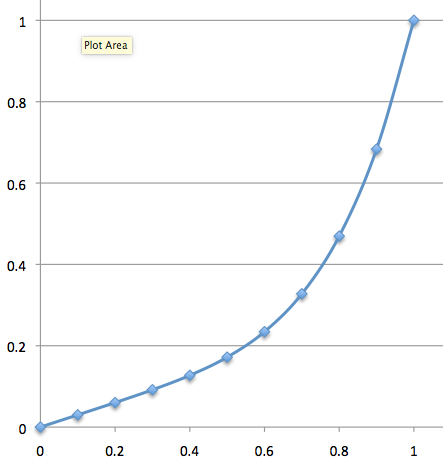 I created a graph in Excel, but was not happy with the result. So I increased the power argument to 5, and that looked much better. A near linear curve up to about x=0.5, then swinging up to y=1 at x=1.