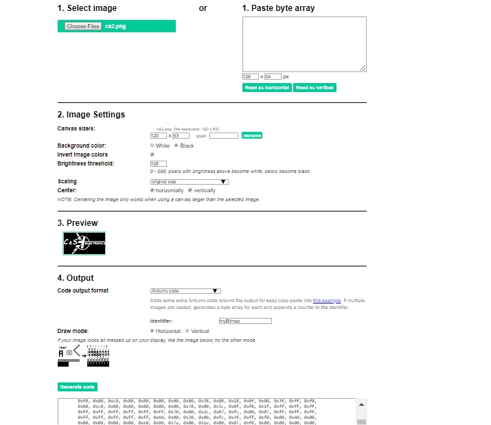 Btw, you included the "Graphene" program in another thread, to create images on the Oled. Unfortunately it is Windows-only software, which my Mac will not swallow. In the search for an alternative I found this http://javl.github.io/image2cpp/. It can be saved as a web archive for offline use, and it should work on both platforms. It will even scale the imported picture to the required size. I have not tried it in a sketch to see how it looks on screen (because I still have to set it up :roll: ), but I thought I'd share it here.
