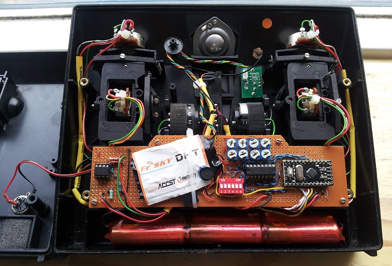 When I understood how analog voltages from 0-5 V could be used for generating numeric values from 0-1023, I went that way. In a 4 channel set these extra controls would require 8 more analog inputs. Problem is, however, that the Nano and Pro Mini only have 8 analog inputs so nothing would be left for stick inputs and ‘special effects’.