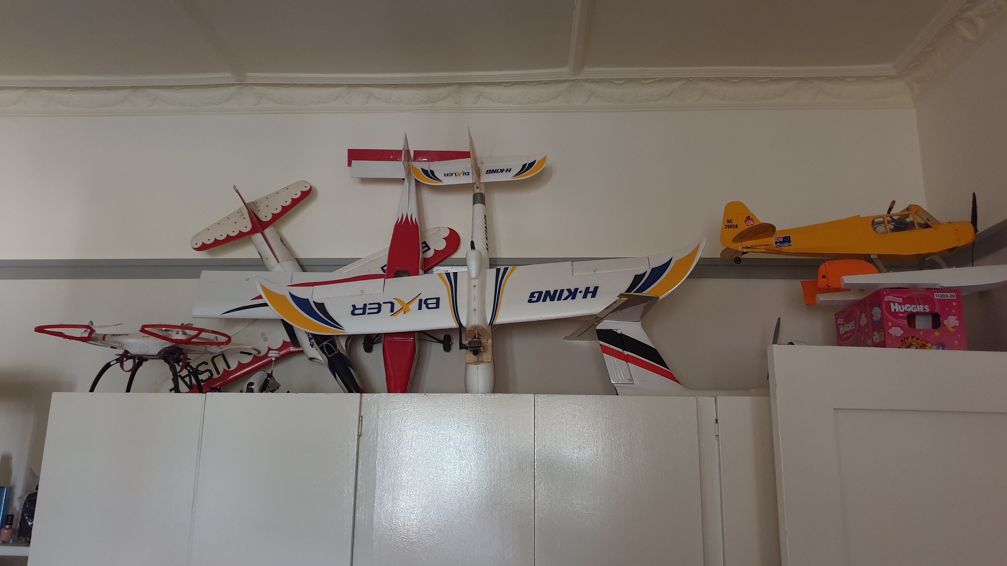 So out went the old innards and in went the new. To begin withI did a fairly basic conversion and kept it at 5 channels (4 propo + switched u/c) and it all worked first time but I found the switched channel too slow for my likings. I mentioned this to Phil who pointed out that there had been a major update and not only is the switched channel now much faster but there is also an option of 1 or 2 seconds transit time..... Much more useable for me. And he volunteered to reprogram/update my now superceded DIY More with the new update. The calibration process is now simpler and also gives the facility for a non-linear throttle response which will be much better for ic engines, particularly diesels! There is also a timer that beeps at an easily set time. Apart from the slow switched channel, there wasn't much wrong with the old encoder but I have to say that the updated version is even better! I added the Rates Rates and Expo functions but I wanted to be able to switch the rates in and out for different manoeuvres so as well as a pot I put a switch in the circuit (Top left in the picture). I also added the extra two channels, one as a conventional pot/trim lever and the second, though a propo channel I have installed with an internal pot but with an external three position switch (Second switch top/left) to give two pre-determined flap settings at the flick of a switch(Thanks Phil!). And I couldn't resist the timer which is the yellow button on the top of the case. I didn't fit the mixers but that will be an easy fit if and when I need them. The red button is the bind button.